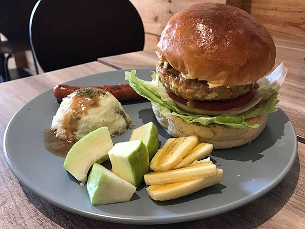 花生培根醬豬堡 套餐 239元 (單點漢堡140元)套餐有:水果、馬零薯泥、德式香腸和ㄧ杯50元的飲料🥤我選tree top 蘋果汁 蠻大杯的本來點的時候在想會不會只有培根
