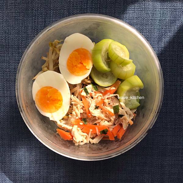 雞絲涼拌(金針菇、紅蘿蔔、鹽、橄欖油、雞絲、蔥花)
